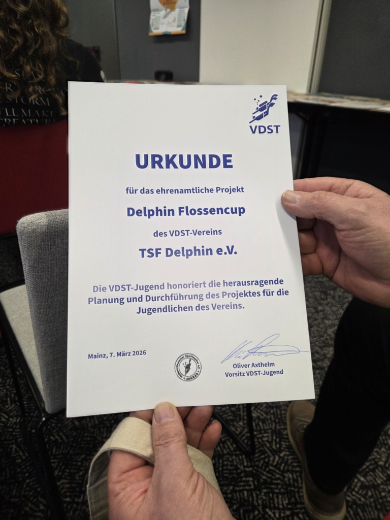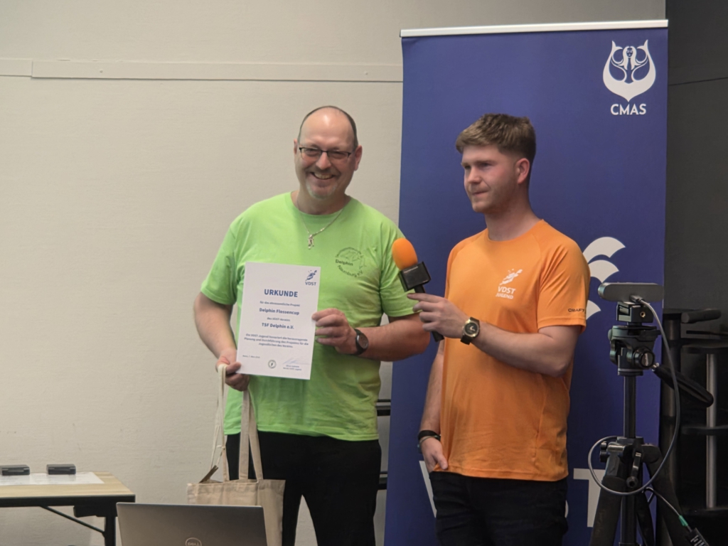 Mit dem TsF Delphin e.V. aus Naumburg konnte einer der drei Förderplätze zur Unterstützung der Jugendarbeit vergeben werden. Stellvertretend für den Verein nahm Fred Kabisch diese Anerkennung entgegen. Ein großer Dank und Respekt gilt den engagierten Organisatoren des Projektes beim TsF Delphin e.V., die mit ihrer Arbeit zeigen, wie lebendig und wertvoll Jugendarbeit im Tauchsport sein kann.